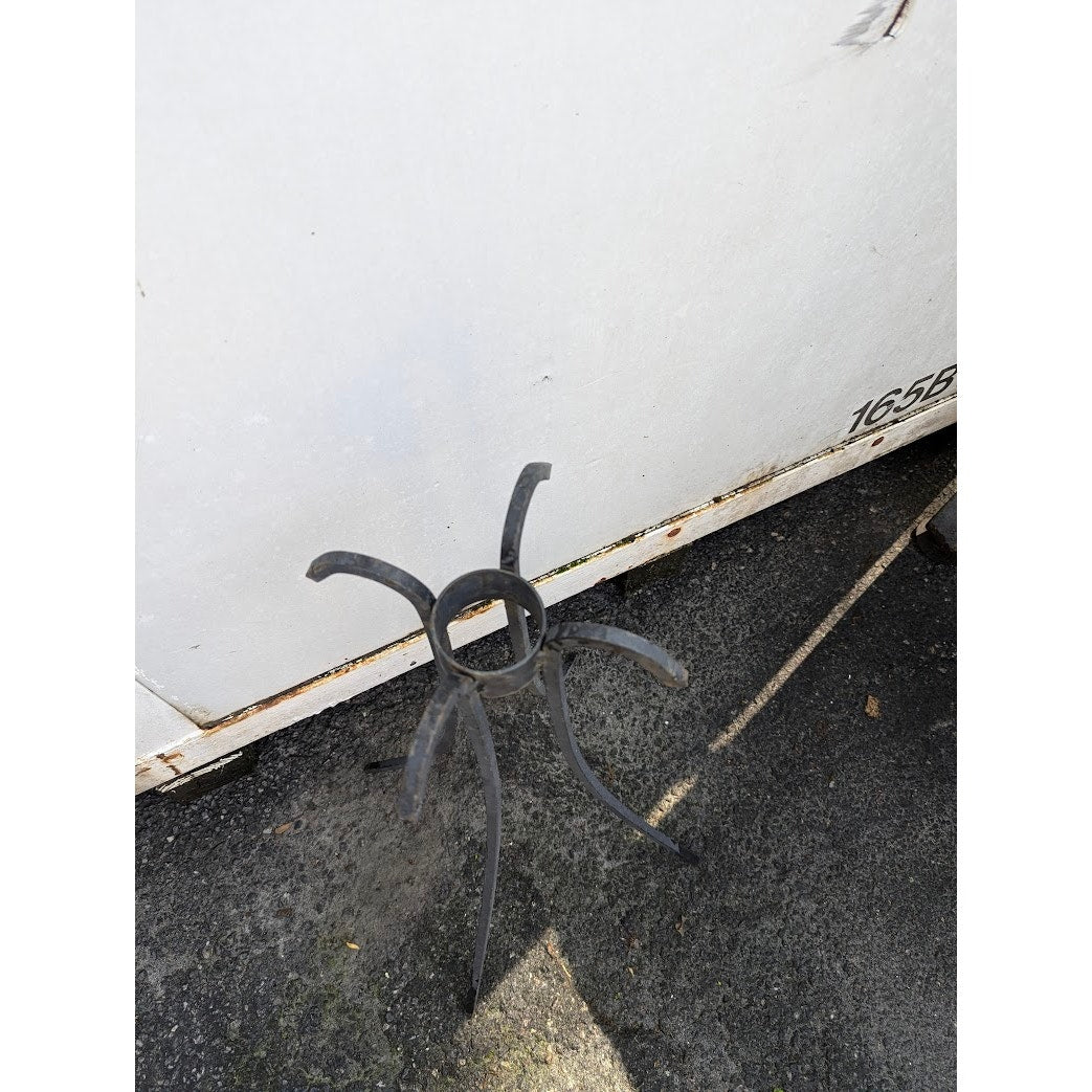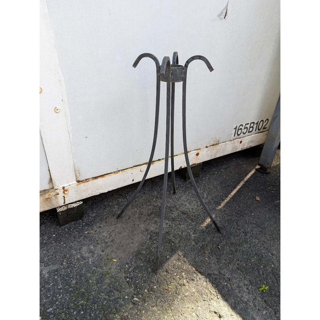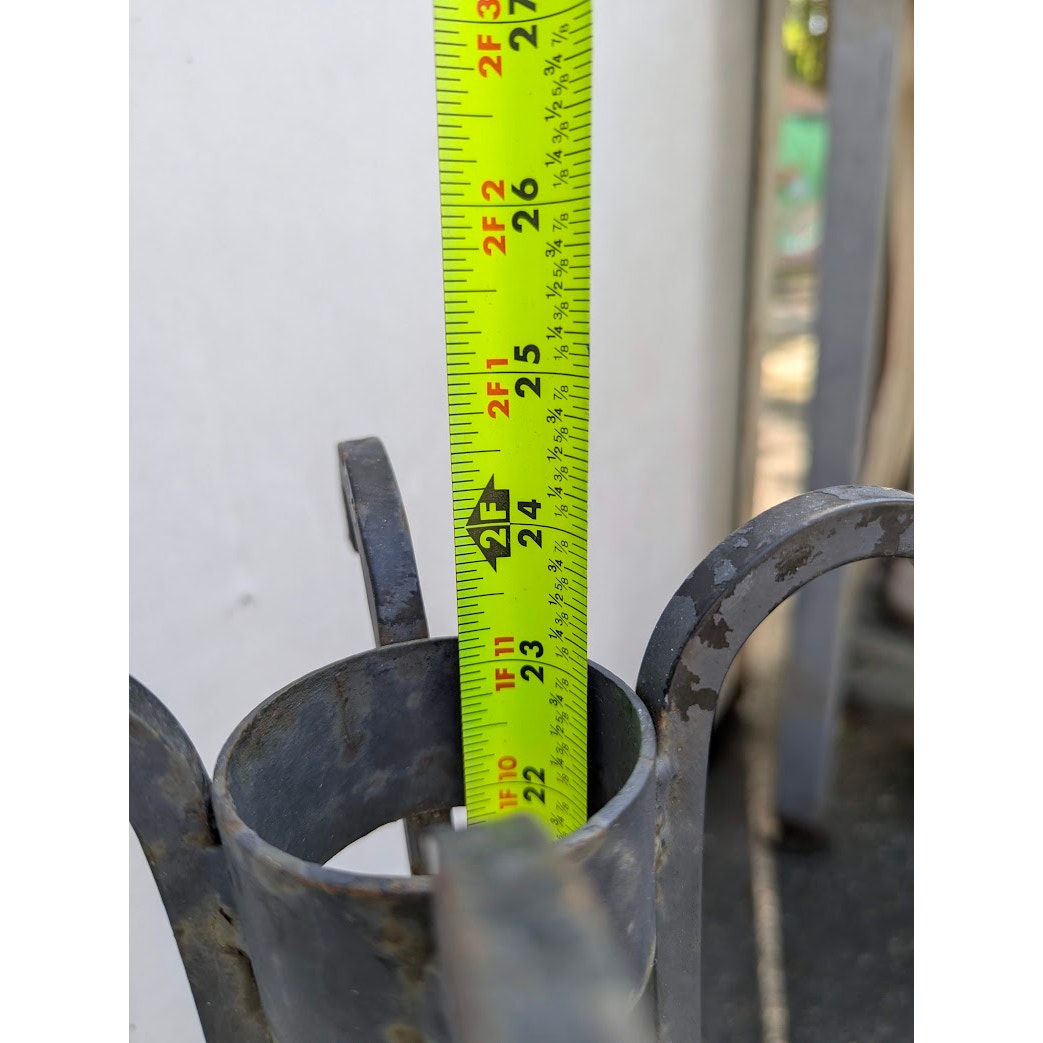 Add a touch of Gothic or Traditional charm to your yard with this sturdy 24" wrought iron gazing ball stand. Perfect for securely displaying your favorite garden globes or planters both indoors and outdoors. It is in good pre-owned condition with some weathering and surface rust typical of outdoor use, adding to its rustic appeal.