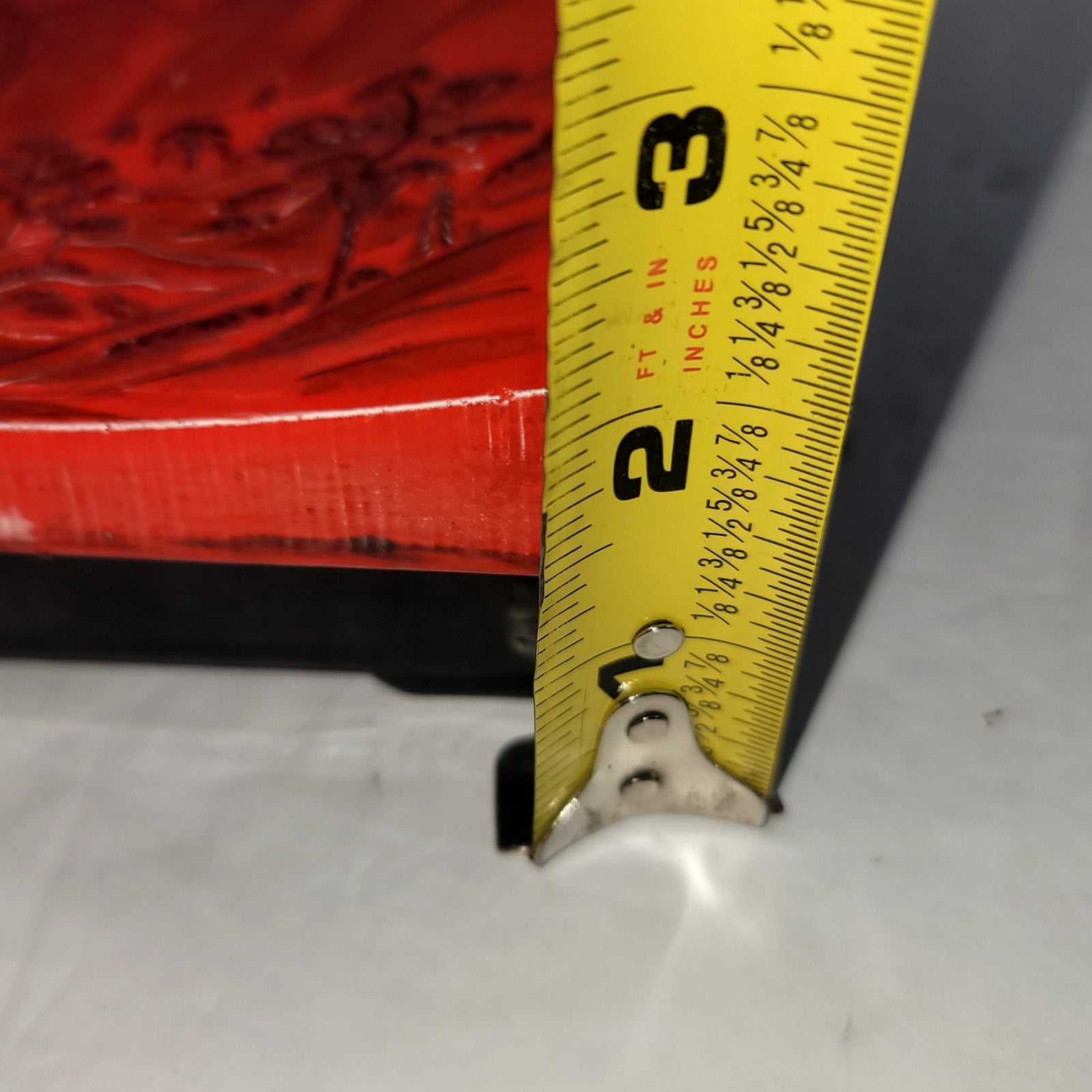 Elevate your vanity or desk with this striking Japanese-inspired ceramic trinket box. This two-piece set features a bold cinnabar-red lid beautifully contrasted by a deep black footed base. The lid is meticulously detailed with a traditional relief landscape scene, showcasing pagodas, mountains, and trees. Its elegant, slightly curved profile and footed design offer a sophisticated "Chinoiserie" or "Dark Academia" aesthetic. Measuring approximately five inches by four inches, it is the perfect size for storing jewelry, keepsakes, or small office supplies while serving as a refined decorative accent.