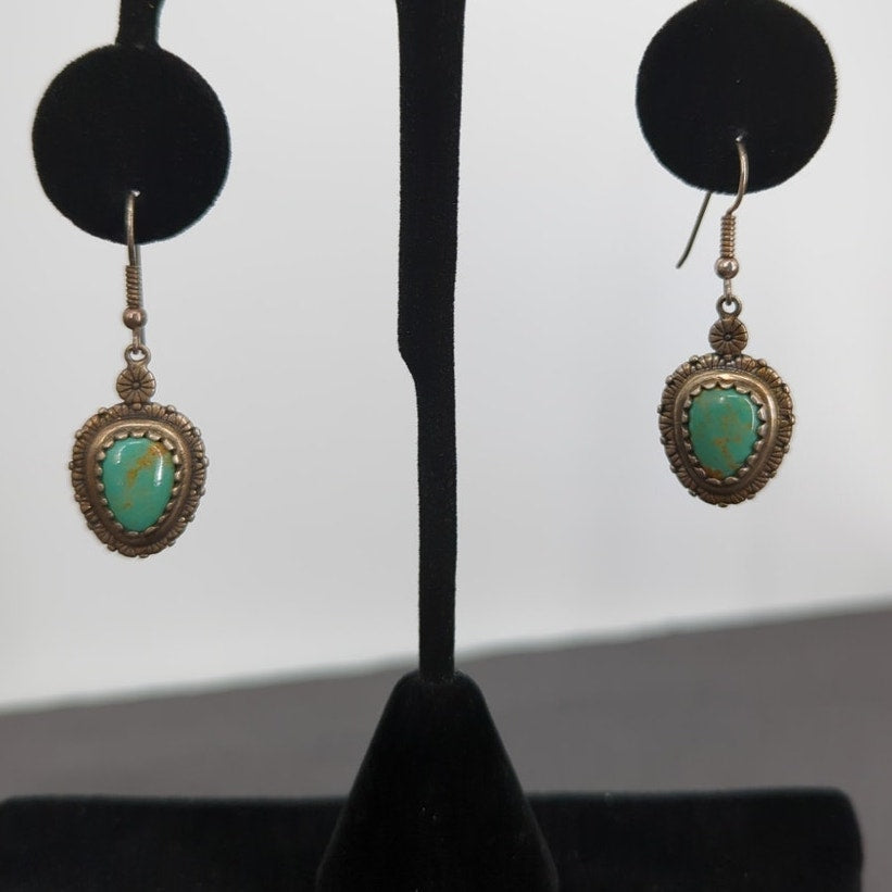 Elevate your collection with these authentic Relios by Carolyn Pollack sterling silver dangle earrings. Crafted in Albuquerque, New Mexico, these pieces feature a vibrant, teardrop-shaped turquoise cabochon set within a decorative scalloped bezel. The oxidized silver finish provides a beautiful contrast that highlights the intricate Southwestern metalwork and earthy matrix of the natural stones.