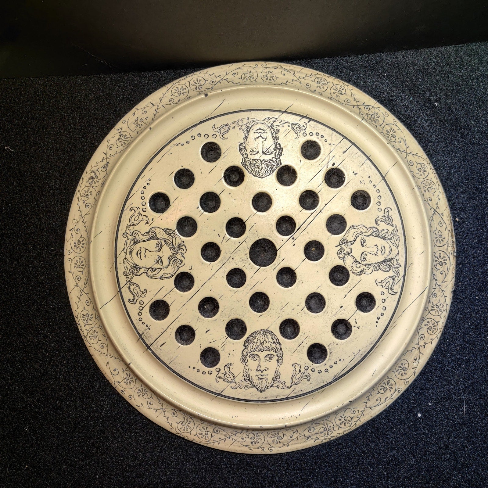 Discover a unique piece of history with this vintage solitaire board. Featuring intricate designs and a timeless appeal, this game is perfect for collectors and enthusiasts alike. The board is crafted from unknown material it is pretty heavy, doing some research there are some similarities to other games that were made from whale bone, I’m not sure what it’s made from, it could be resin. This is a RARE and beautiful piece measuring 8.5"inches in diameter. There is no marks by a maker and date manufactured is unknown