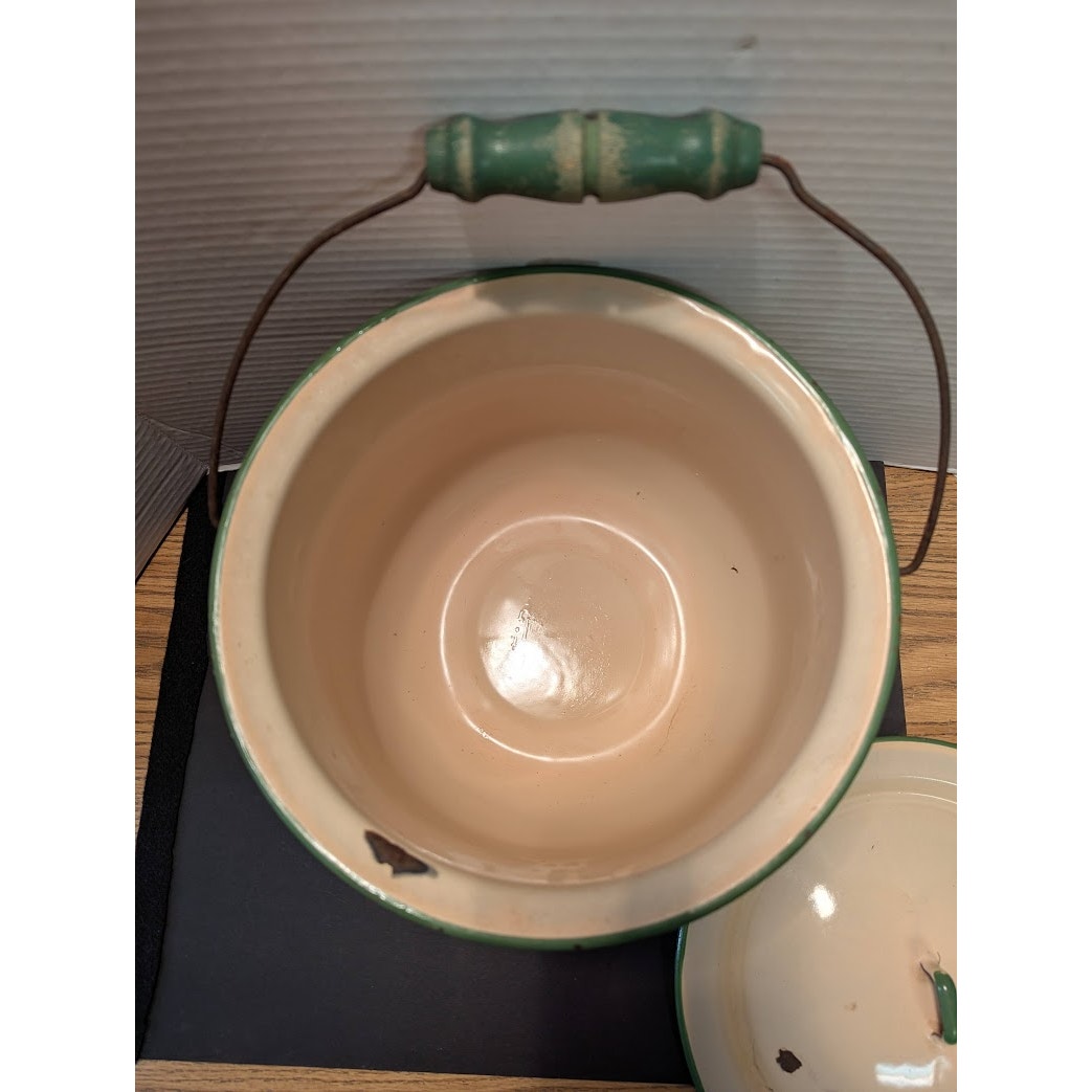 Vintage 1940's Cream Green Enamelware Pail Chamber Pot Slop Jar Wood Handle