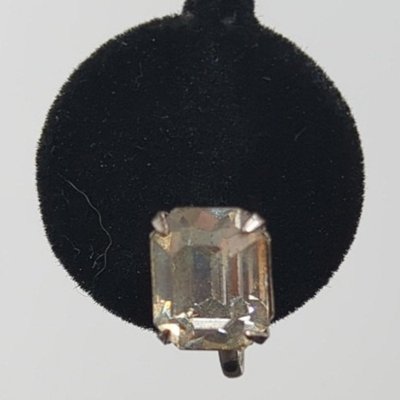Single emerald cut clear rhinestone stations Mid-century minimalist solitaire style Polished silver-tone plating & prong settings Secure & adjustable screw back closure