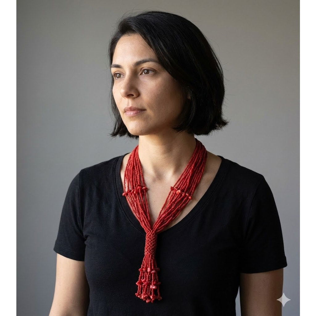#RedSeedBead #VintageStatement #WaterfallNecklace #BohoGlam #MobWifeAesthetic #LiquidBeads #ArtToWear #RedTassel #VintageJewelry #MaximalistStyle