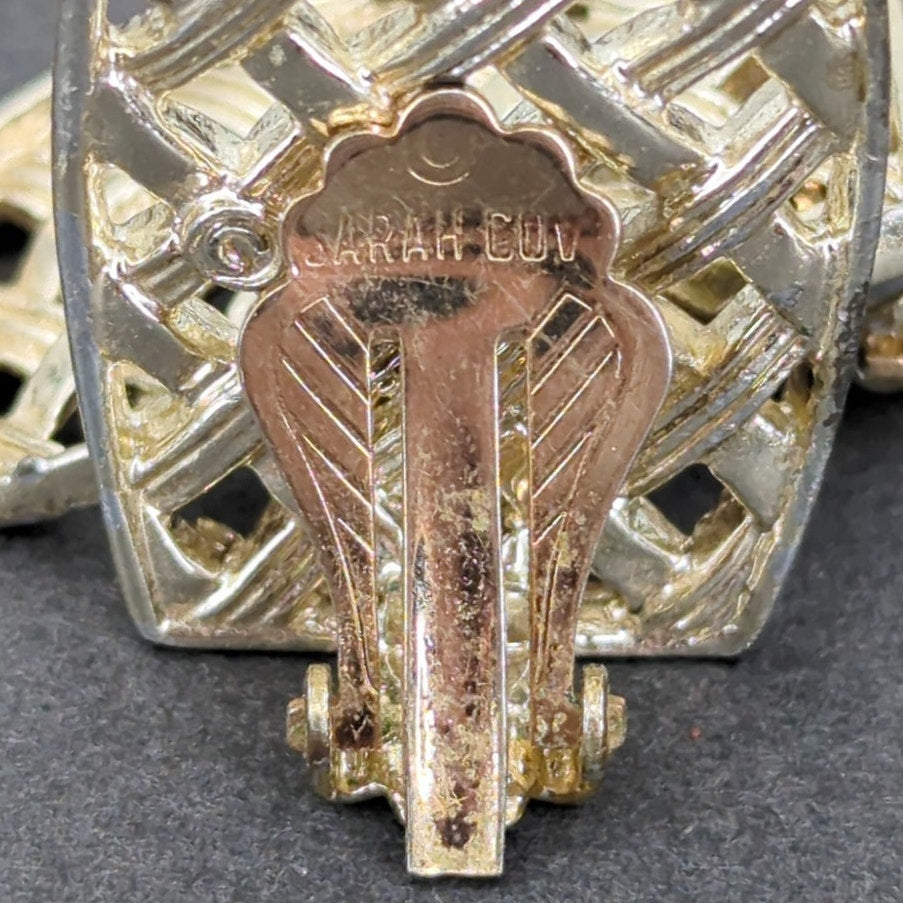 Textured gold-tone basketweave motif Vintage 1960s/1970s geometric statement style Polished gold-tone plating Signed "Sarah Cov" secure clip on closure